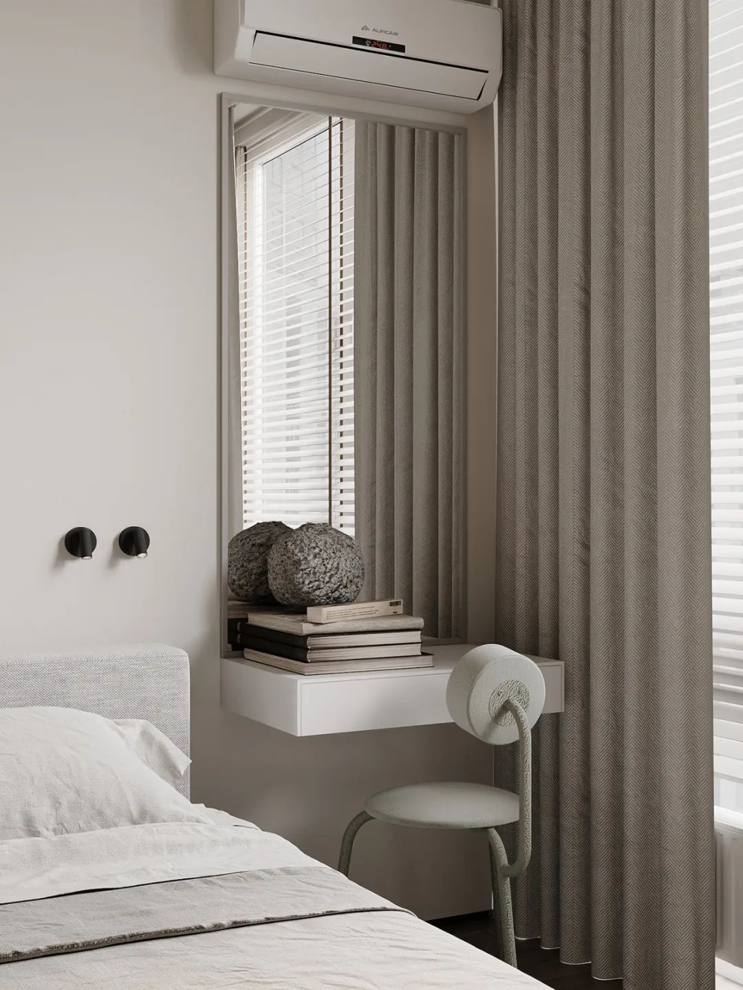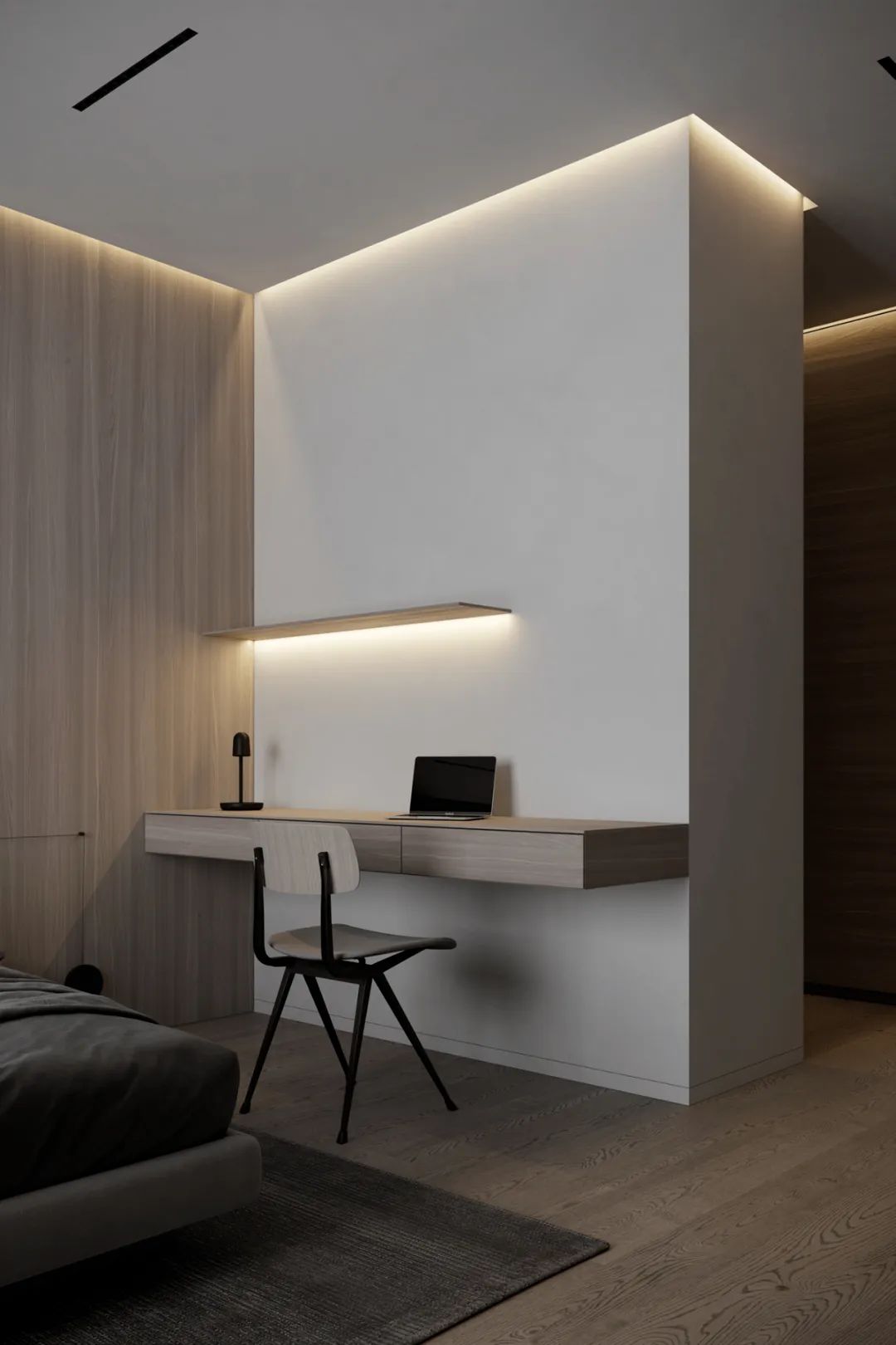 میزهای کنار تختخواب سنتی فضای زیادی را اشغال می کنند و فاقد شخصی سازی و حس مد هستند. تعلیق میز کنار تخت روی دیوار و سفارشی کردن آن به طور یکپارچه با دیوار پس زمینه ، ظاهری 整齐划一 و پیشرفته ایجاد می کند.
