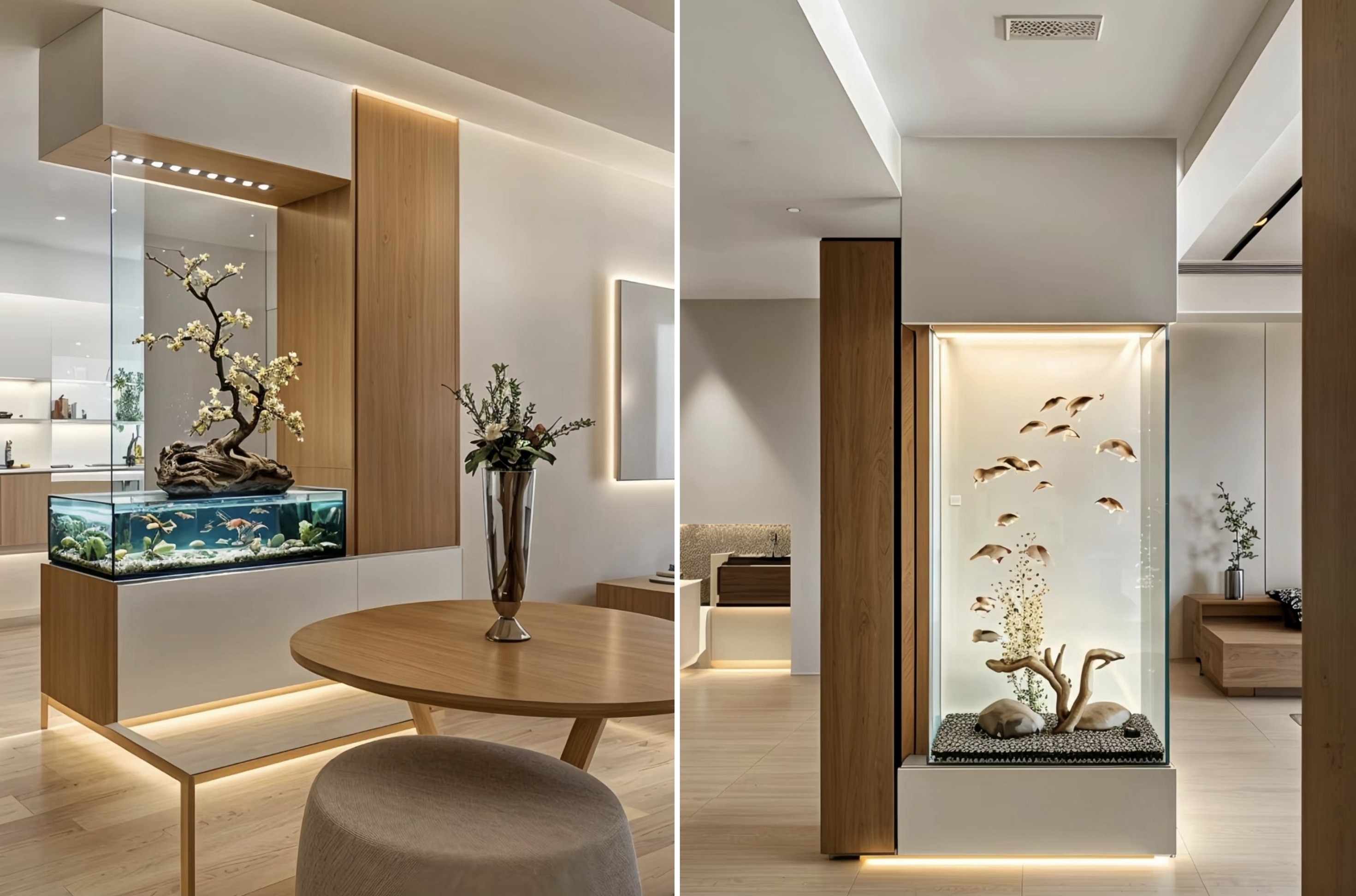 یک اکو-آکاریوم به عنوان یک کانون کانونی عمل می کند و یک لمس بازیگوش و پویا به خانه اضافه می کند.